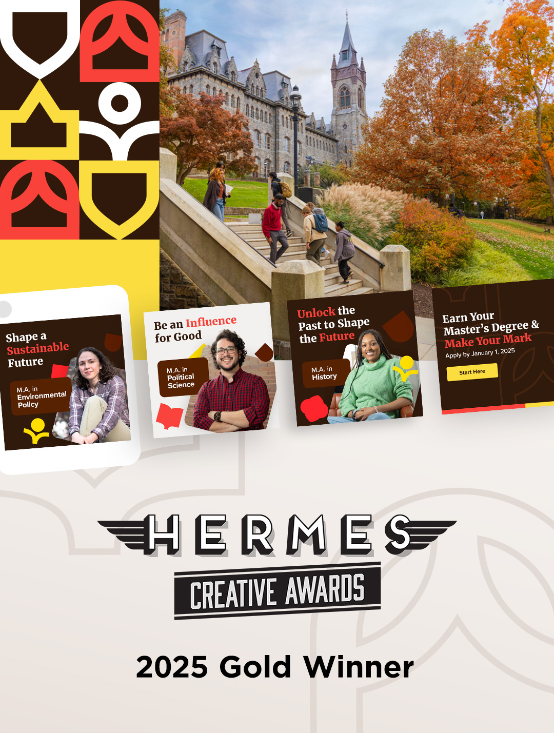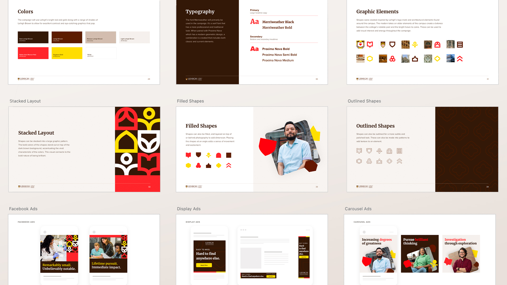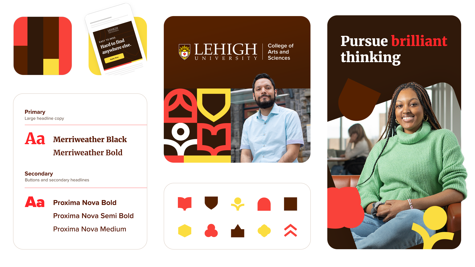 Art direction focused on making every interaction feel like a natural extension of the Lehigh experience. Using their established visual guidelines, our graphic elements drew inspiration from the iconic logomark as well as the stunning architecture that defines its historic campus. With buildings dating back to the 1800s and a library recently named one of the world’s most stunning by Architectural Digest, Lehigh’s campus was more than a backdrop—it was a story waiting to be told. We infused this rich history into vibrant, modern graphics, using these versatile elements to frame photography, create new dynamic patterns, and add subtle textures, all while maintaining a cohesive look that honored Lehigh’s past and signaled its bright future.