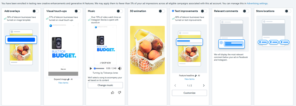 On platforms like Meta, some AI settings might even mean the creative you worked hard on looks completely different than what was originally built. Settings like adding music, manipulation of your graphics, adding extra links you haven’t added UTM parameters to, and more can make the ad experience for your target audience confusing and misleading!